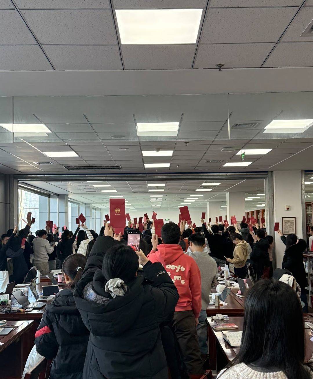 现场收到红包的吉林大学研究生小刘(化名)告诉极目新闻记者,当天上午9时55分,学校校长、党委副书记张希带领着其他校领导来到学校中心图书馆,给在场的每位同学都发了200元的祝福红包。